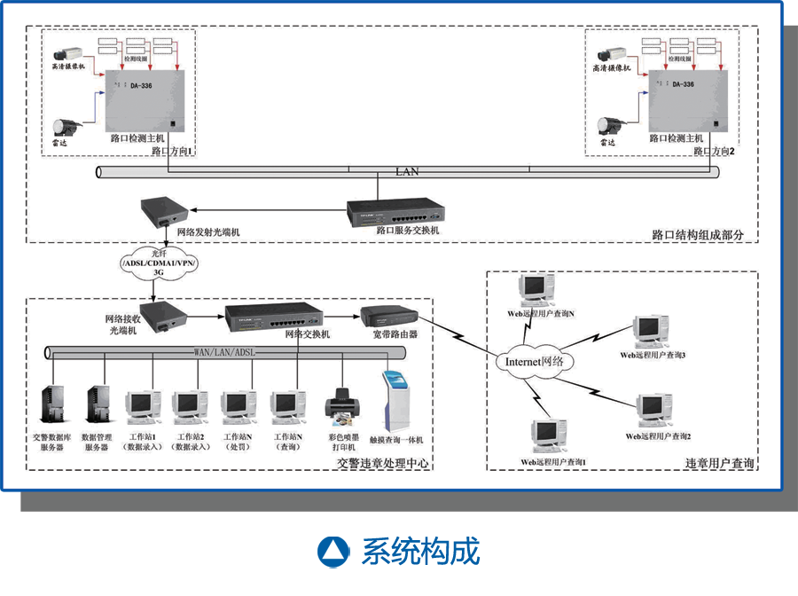 DA-366公路車輛智能監(jiān)測(區(qū)間測速)自動記錄系統(tǒng)由二套及以上的前端系統(tǒng)構(gòu)建區(qū)間測速點,準確記錄通過車輛的時間及圖片,通過自動識別軟件提取車牌等相關(guān)信息,并將這些信息匯總到后臺服務(wù)器的數(shù)據(jù)庫處理。前端系統(tǒng)由車輛通過檢測單元、車輛通過監(jiān)控程序(儀表)、抓拍設(shè)備、主控程序、地感線圈組、閃光燈組件等部分組成。各個前端處理系統(tǒng)和后端系統(tǒng)以TCP/IP的方式組成局域網(wǎng),構(gòu)成完整的DA-356A區(qū)間測速自動記錄系統(tǒng)。前端采集到的車輛違法圖片被分類存儲在斷面服務(wù)器,圖片通過聯(lián)網(wǎng)將圖片傳送至后端系統(tǒng),完成車牌識別、入庫處理后,到達數(shù)據(jù)、控制中心,傳輸網(wǎng)絡(luò)可以是光纖、ADSL或其它有無線網(wǎng)絡(luò),并具備斷點續(xù)傳功能。